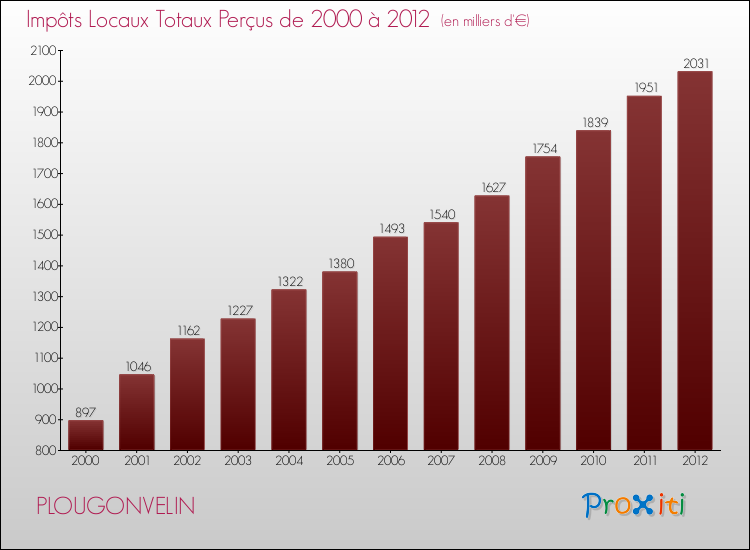 A Plougonvelin, les impôts locaux par habitant ont donc augmentés de 74.27 % entre 2000 et 2012.