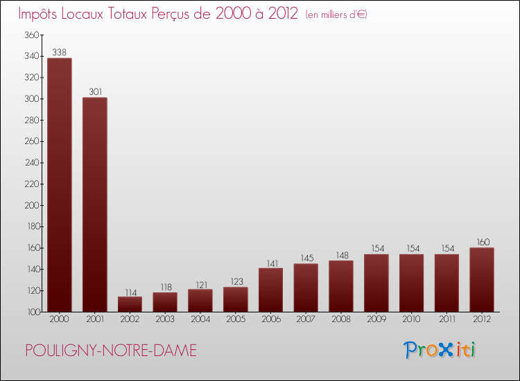 Evolution des Impôts Locaux perçus par la commune de POULIGNY-NOTRE-DAME de 2000 à 2012