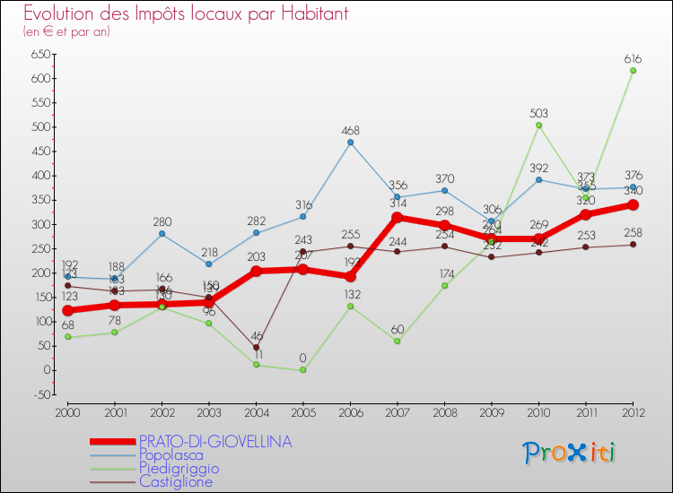 A Prato-di-Giovellina, les impôts locaux par habitant ont donc augmentés de 176.42 % entre 2000 et 2012.