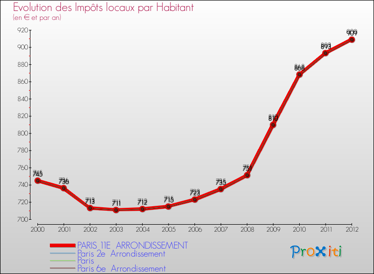 A Paris 11e Arrondissement, les impôts locaux par habitant ont donc augmentés de 22.01 % entre 2000 et 2012.
