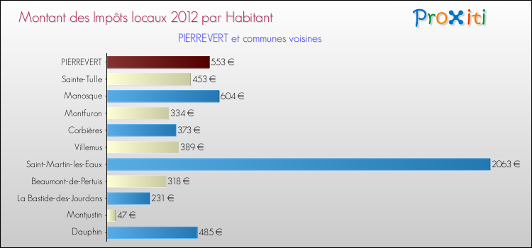 A Pierrevert, en 2012 les impôts locaux par habitant sont donc plus élevés de 42.89 % que pour des communes similaires.