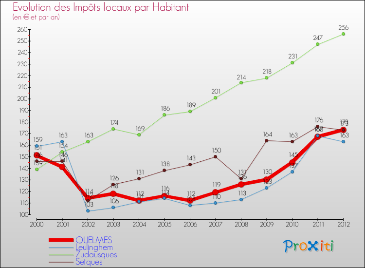 A Quelmes, les impôts locaux par habitant ont donc augmentés de 14.57 % entre 2000 et 2012.