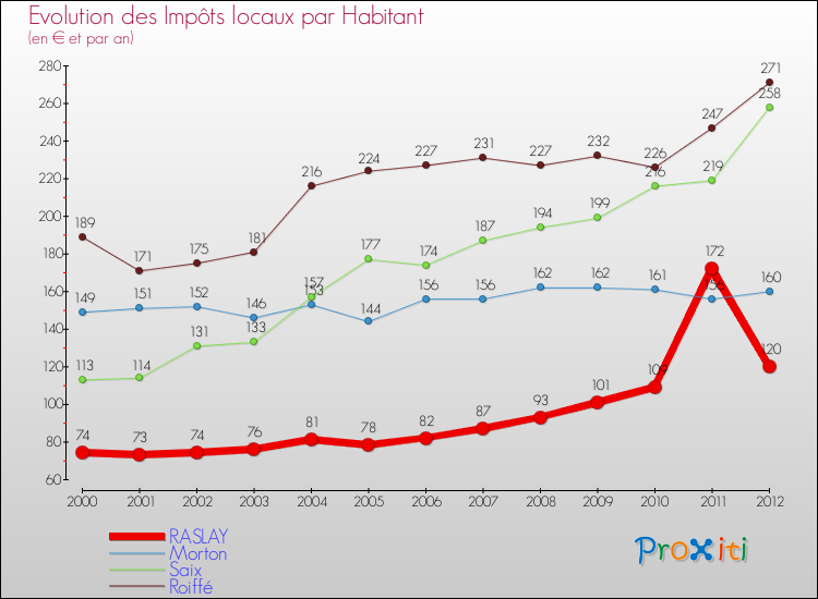 A Raslay, les impôts locaux par habitant ont donc augmentés de 62.16 % entre 2000 et 2012.