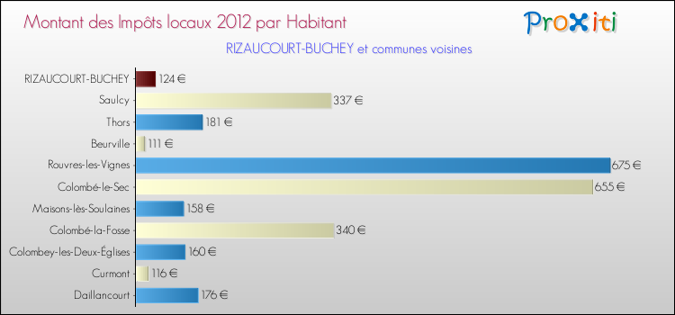 A Rizaucourt-Buchey, en 2012 les impôts locaux par habitant sont donc plus bas de 50 % que pour des communes similaires.