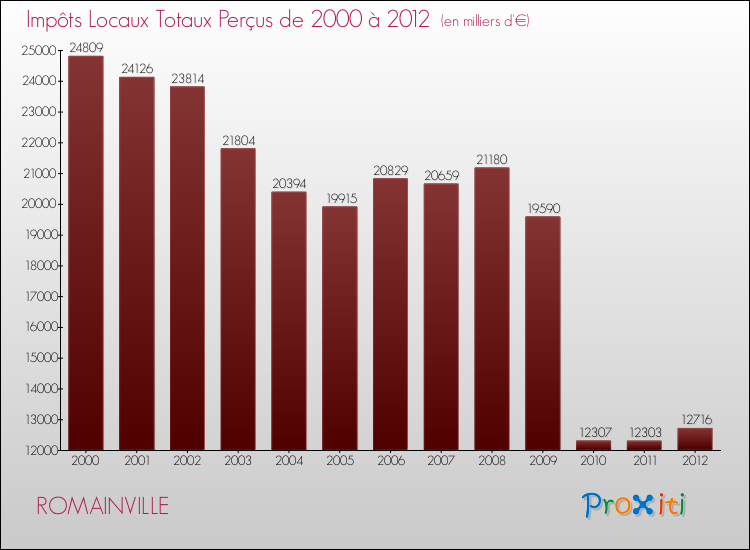 Evolution des Impôts Locaux perçus par la commune de ROMAINVILLE de 2000 à 2012