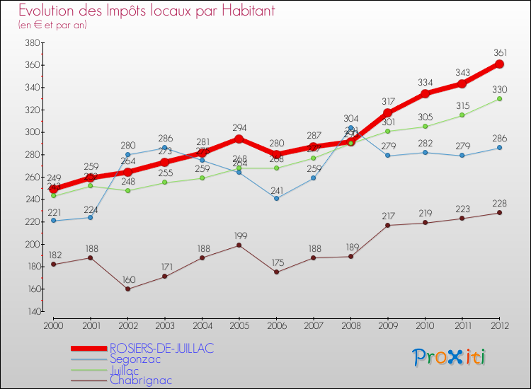 A Rosiers-de-Juillac, les impôts locaux par habitant ont donc augmentés de 44.98 % entre 2000 et 2012.