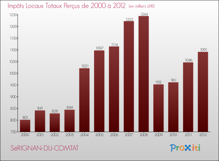 Evolution des Impôts Locaux perçus par la commune de SéRIGNAN-DU-COMTAT de 2000 à 2012