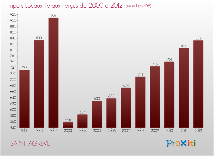 Evolution des Impôts Locaux perçus par la commune de SAINT-AGRèVE de 2000 à 2012