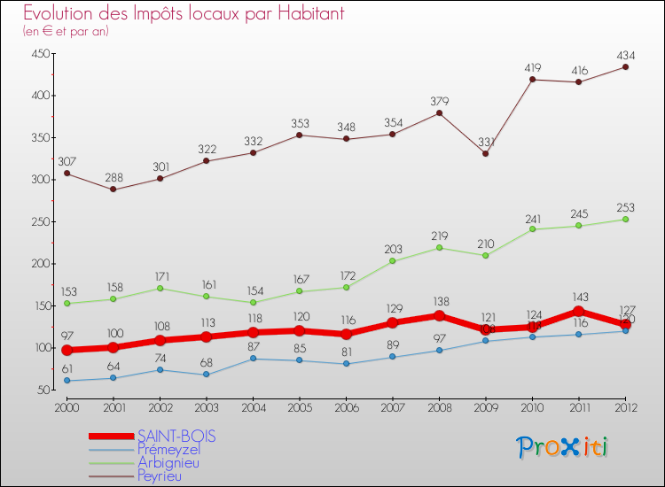 A Saint-Bois, les impôts locaux par habitant ont donc augmentés de 30.93 % entre 2000 et 2012.