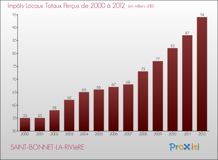 Evolution des Impôts Locaux perçus par la commune de SAINT-BONNET-LA-RIVIèRE de 2000 à 2012