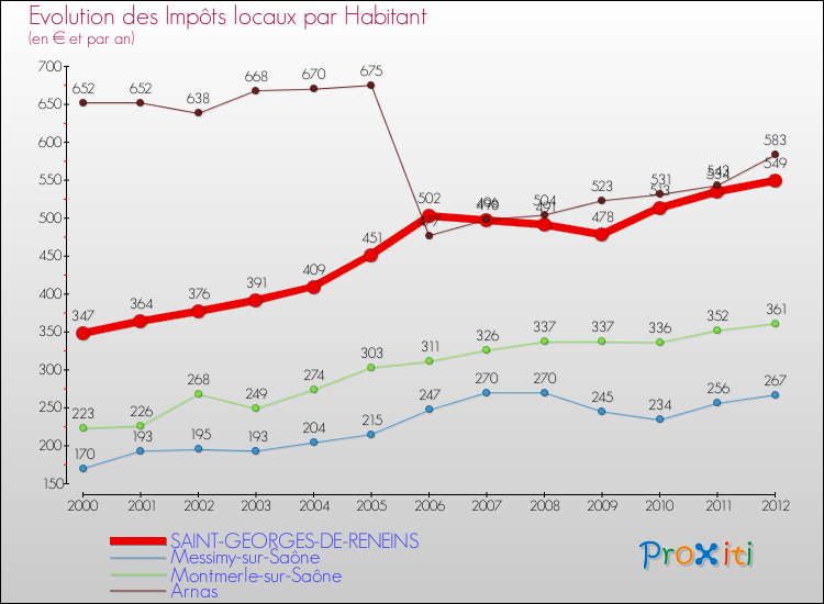 A Saint-Georges-de-Reneins, les impôts locaux par habitant ont donc augmentés de 58.21 % entre 2000 et 2012.