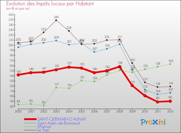 Evolution des Impôts Locaux pour SAINT-GERMAIN-D'AUNAY de 2000 à 2012