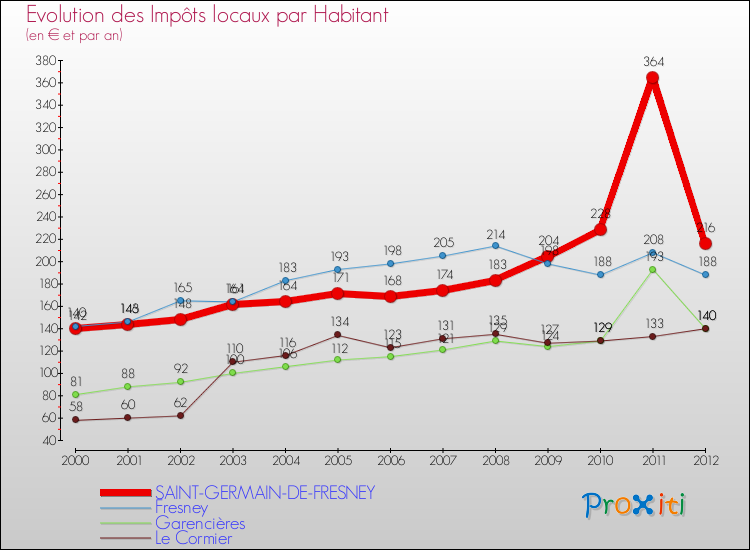 A Saint-Germain-de-Fresney, les impôts locaux par habitant ont donc augmentés de 54.29 % entre 2000 et 2012.