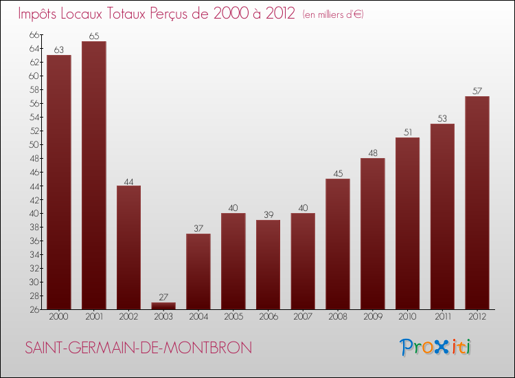 Evolution des Impôts Locaux perçus par la commune de SAINT-GERMAIN-DE-MONTBRON de 2000 à 2012