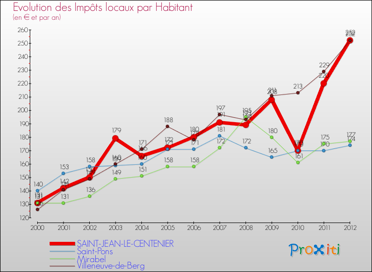A Saint-Jean-le-Centenier, les impôts locaux par habitant ont donc augmentés de 92.37 % entre 2000 et 2012.