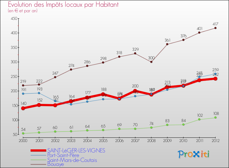A Saint-Léger-les-Vignes, les impôts locaux par habitant ont donc augmentés de 72.86 % entre 2000 et 2012.