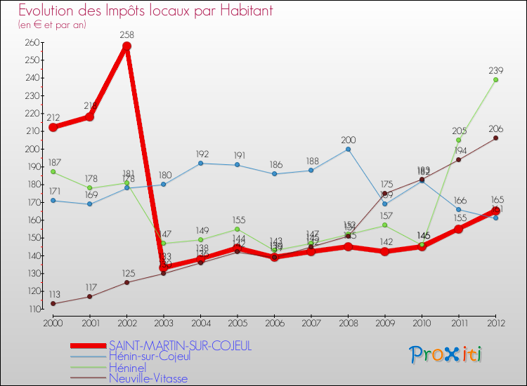 Pendant la même période, les communes françaises similaires à Saint-Martin-sur-Cojeul, ont vu leurs impôts locaux par habitant augmenter de 60 % en moyenne entre 2000 et 2012.