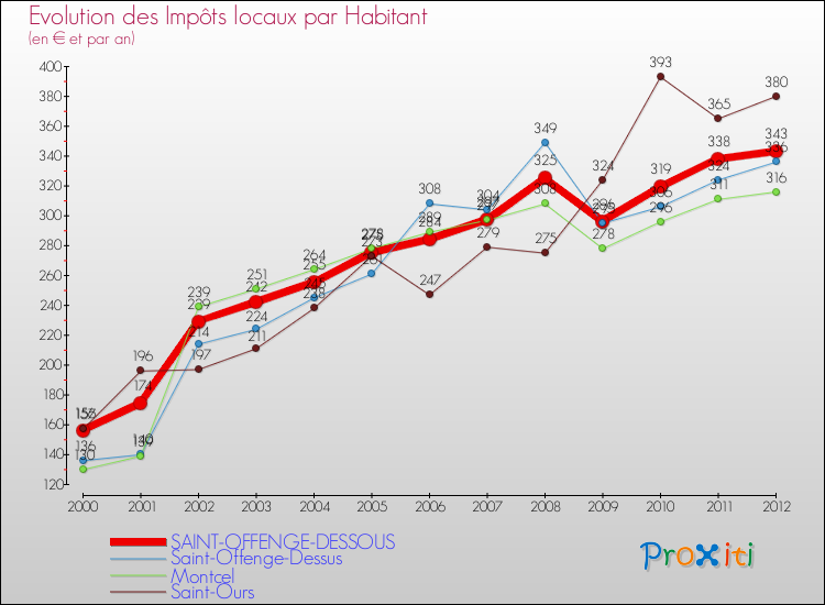 A Saint-Offenge-Dessous, les impôts locaux par habitant ont donc augmentés de 119.87 % entre 2000 et 2012.