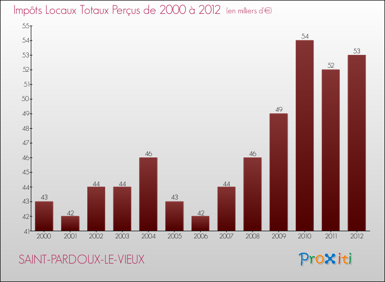 Evolution des Impôts Locaux perçus par la commune de SAINT-PARDOUX-LE-VIEUX de 2000 à 2012