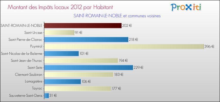A Saint-Romain-le-Noble, en 2012 les impôts locaux par habitant sont donc plus bas de 25.74 % que pour des communes similaires.