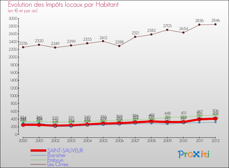 A Saint-Sauveur, les impôts locaux par habitant ont donc augmentés de 65.85 % entre 2000 et 2012.
