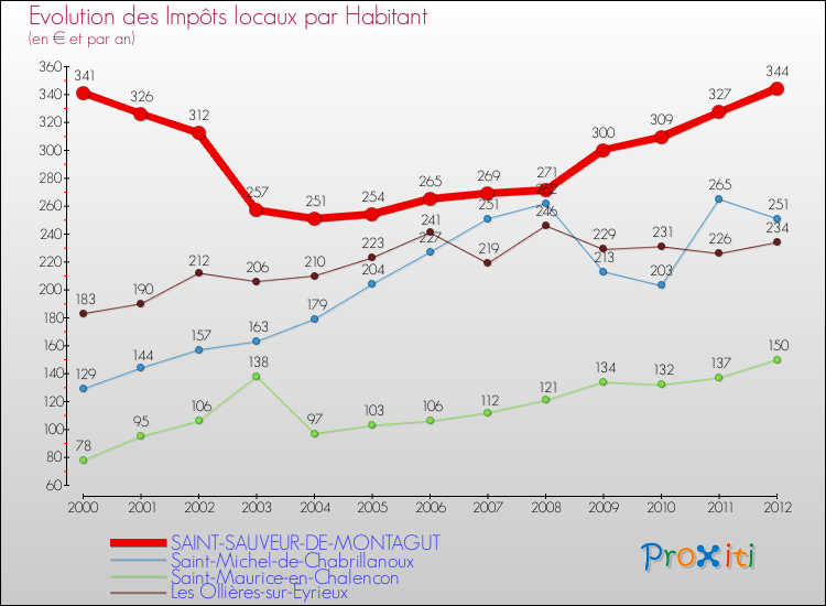 A Saint-Sauveur-de-Montagut, les impôts locaux par habitant ont donc augmentés de 0.88 % entre 2000 et 2012.