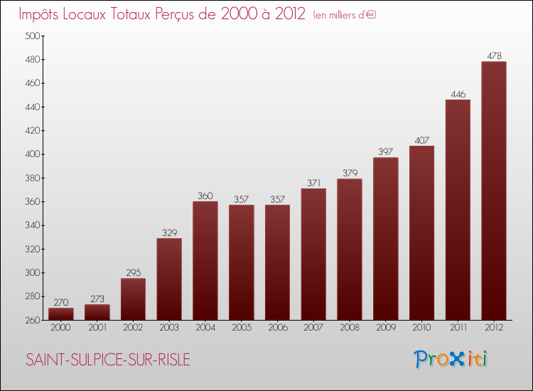 Evolution des Impôts Locaux perçus par la commune de SAINT-SULPICE-SUR-RISLE de 2000 à 2012