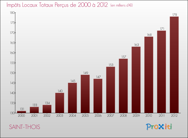 A Saint-Thois, les impôts locaux par habitant ont donc augmentés de 20.1 % entre 2000 et 2012.