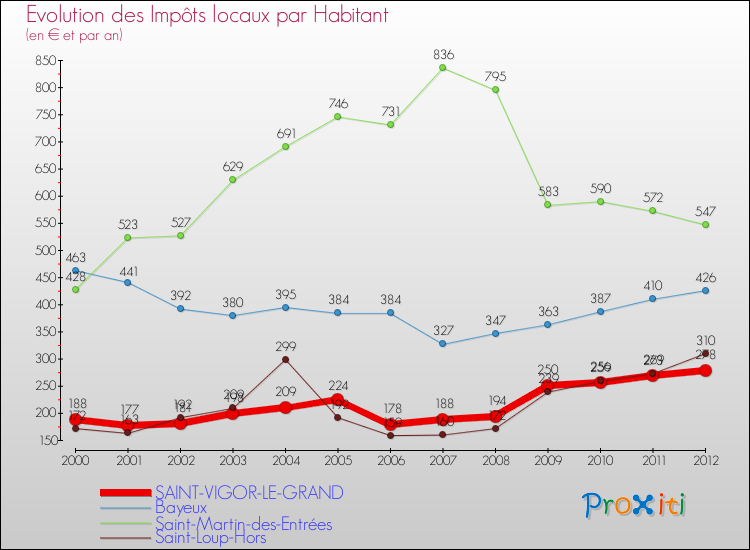 A Saint-Vigor-le-Grand, les impôts locaux par habitant ont donc augmentés de 47.87 % entre 2000 et 2012.