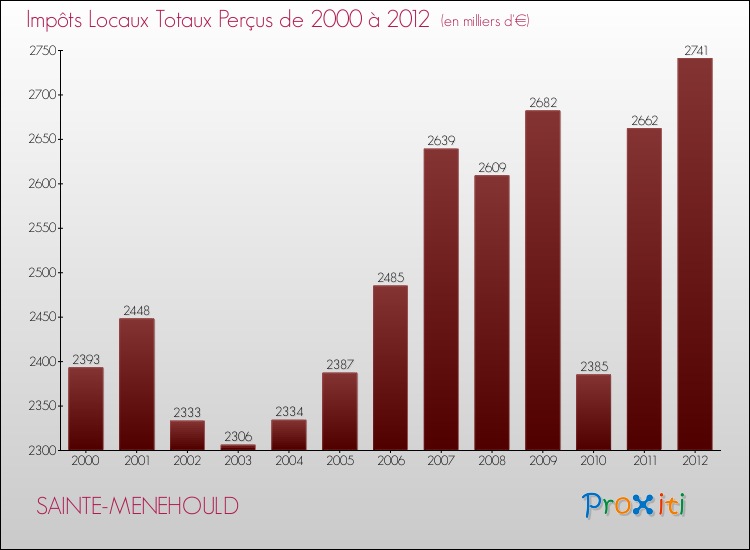 Evolution des Impôts Locaux perçus par la commune de SAINTE-MENEHOULD de 2000 à 2012