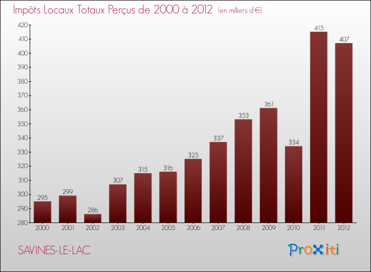 Evolution des Impôts Locaux perçus par la commune de SAVINES-LE-LAC de 2000 à 2012
