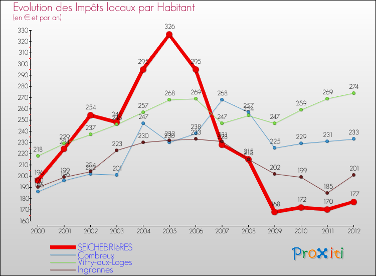 A Seichebrières, les impôts locaux par habitant ont donc baissés de 9.69 % entre 2000 et 2012.