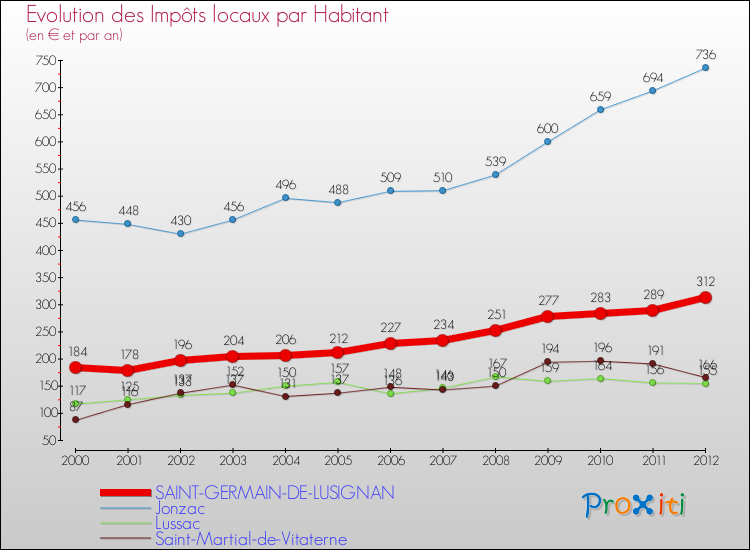 A Saint-Germain-de-Lusignan, les impôts locaux par habitant ont donc augmentés de 69.57 % entre 2000 et 2012.