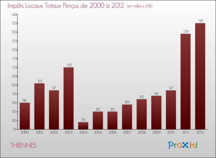 A Thiennes, les impôts locaux par habitant ont donc augmentés de 61.54 % entre 2000 et 2012.