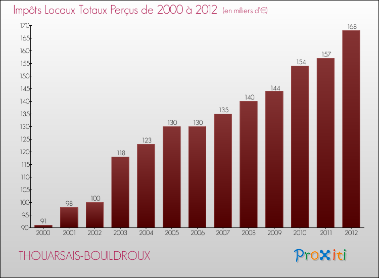 Evolution des Impôts Locaux perçus par la commune de THOUARSAIS-BOUILDROUX de 2000 à 2012