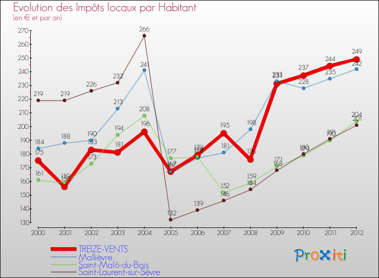 A Treize-Vents, les impôts locaux par habitant ont donc augmentés de 42.29 % entre 2000 et 2012.