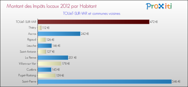 A Touët-sur-Var, en 2012 les impôts locaux par habitant sont donc plus élevés de 36.81 % que pour des communes similaires.