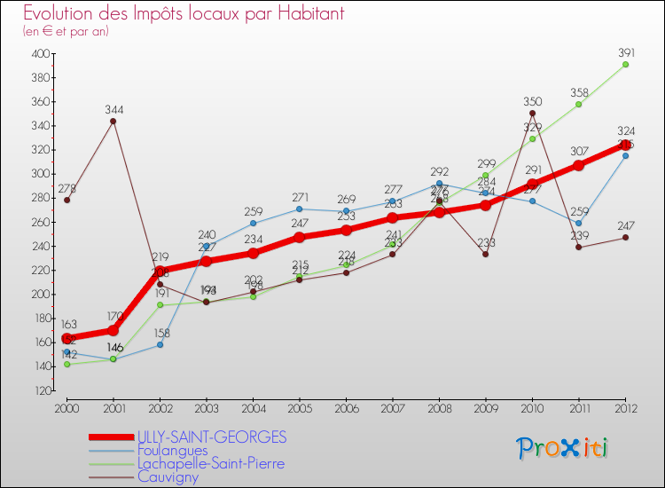Pendant la même période, les communes françaises similaires à Ully-Saint-Georges, ont vu leurs impôts locaux par habitant augmenter de 33.17 % en moyenne entre 2000 et 2012.