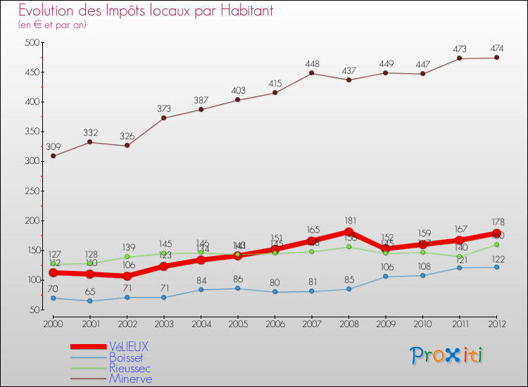 A Vélieux, les impôts locaux par habitant ont donc augmentés de 58.93 % entre 2000 et 2012.