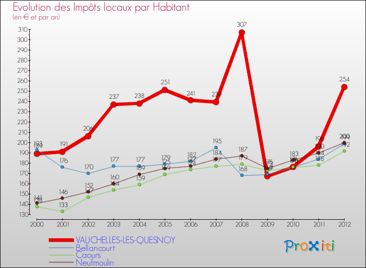 A Vauchelles-les-Quesnoy, les impôts locaux par habitant ont donc augmentés de 34.39 % entre 2000 et 2012.