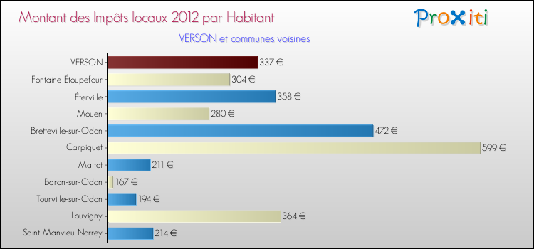 A Verson, en 2012 les impôts locaux par habitant sont donc plus bas de 12.92 % que pour des communes similaires.