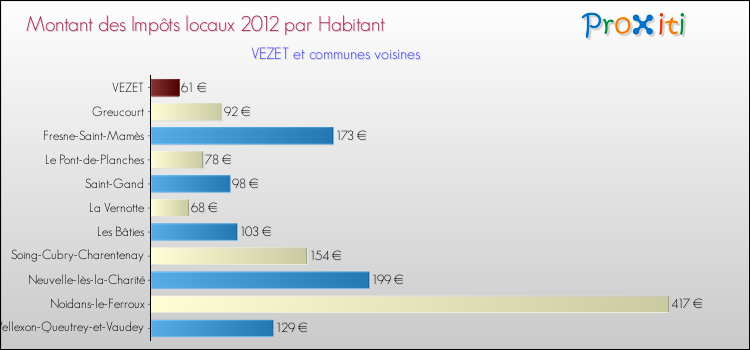 A Vezet, en 2012 les impôts locaux par habitant sont donc plus bas de 75.1 % que pour des communes similaires.