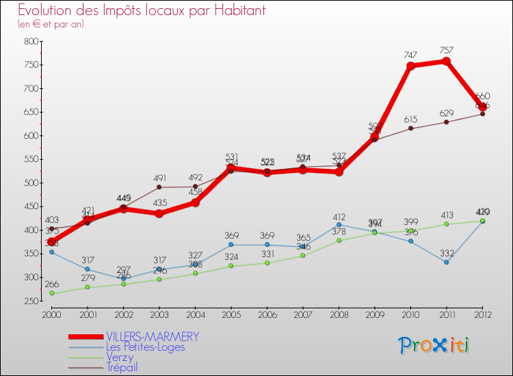 A Villers-Marmery, les impôts locaux par habitant ont donc augmentés de 76 % entre 2000 et 2012.