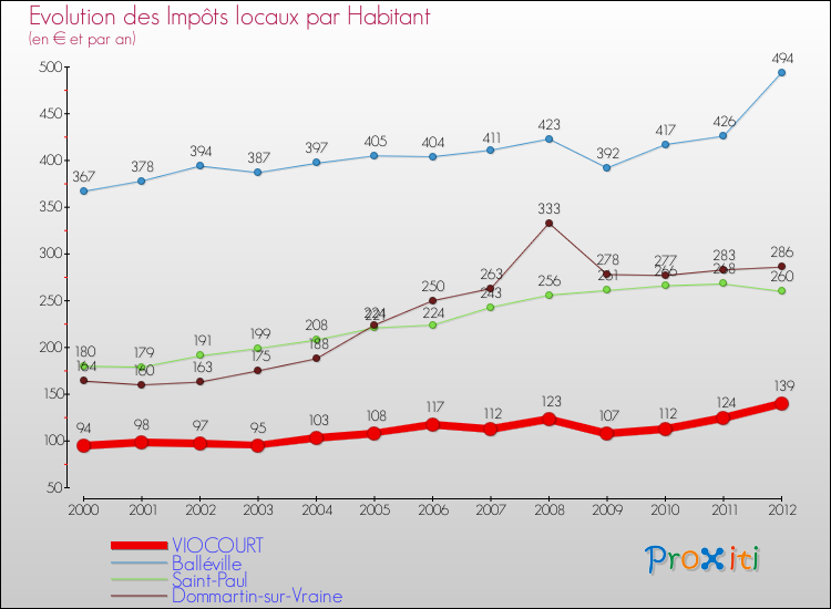 A Viocourt, les impôts locaux par habitant ont donc augmentés de 47.87 % entre 2000 et 2012.