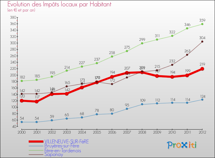 A Villeneuve-sur-Fère, les impôts locaux par habitant ont donc augmentés de 82.5 % entre 2000 et 2012.