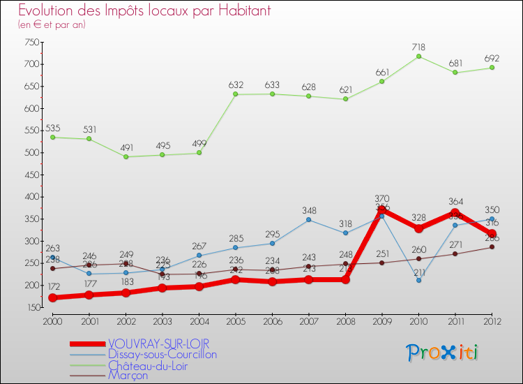 A Vouvray-sur-Loir, les impôts locaux par habitant ont donc augmentés de 83.72 % entre 2000 et 2012.
