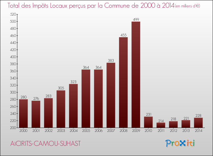 Evolution des Impôts Locaux perçus par la commune de AïCIRITS-CAMOU-SUHAST de 2000 à 2014