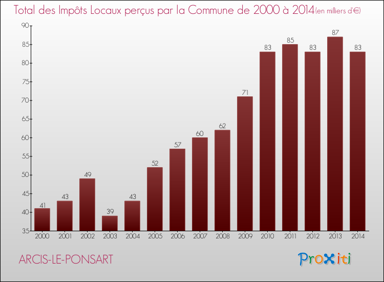 A Arcis-le-Ponsart, les impôts locaux par habitant ont donc augmentés de 89.68 % entre 2000 et 2014.