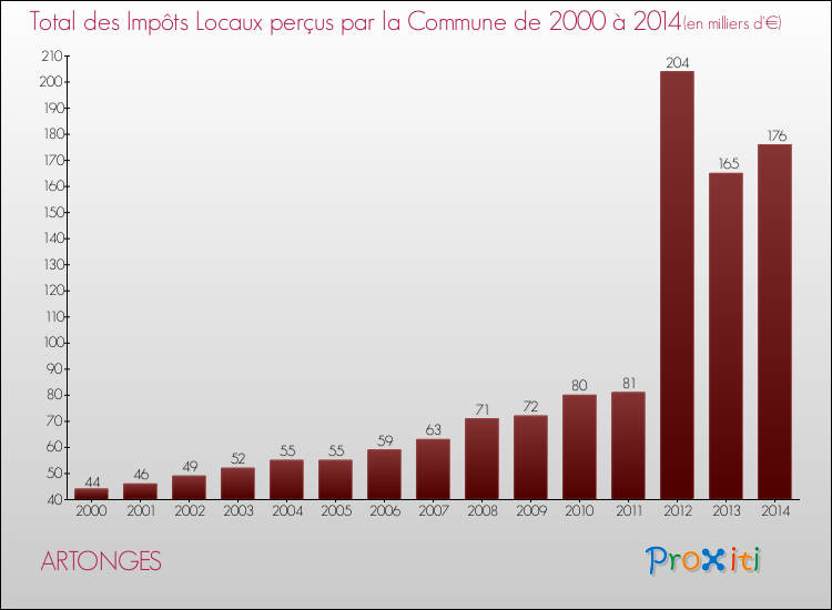 En 2014, le total des impôts locaux encaissés par la commune de Artonges se montait à : 176 000 €.