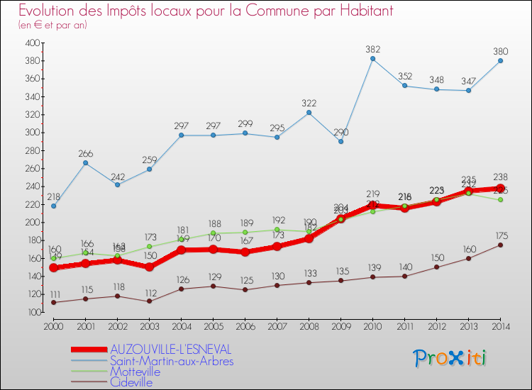 A Auzouville-l'Esneval, les impôts locaux par habitant ont donc augmentés de 59.73 % entre 2000 et 2014.